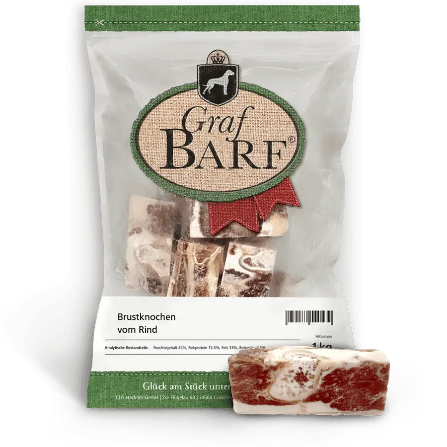 Bitte beachten Sie, dass der Brustknochen aufgrund seiner naturgegebenen Form deutlich von der typischen Graf Barf Würfelform abweicht. Die Rinderknochen sind einzeln gefroren und somit sehr gut zum Portionieren geeignet.
